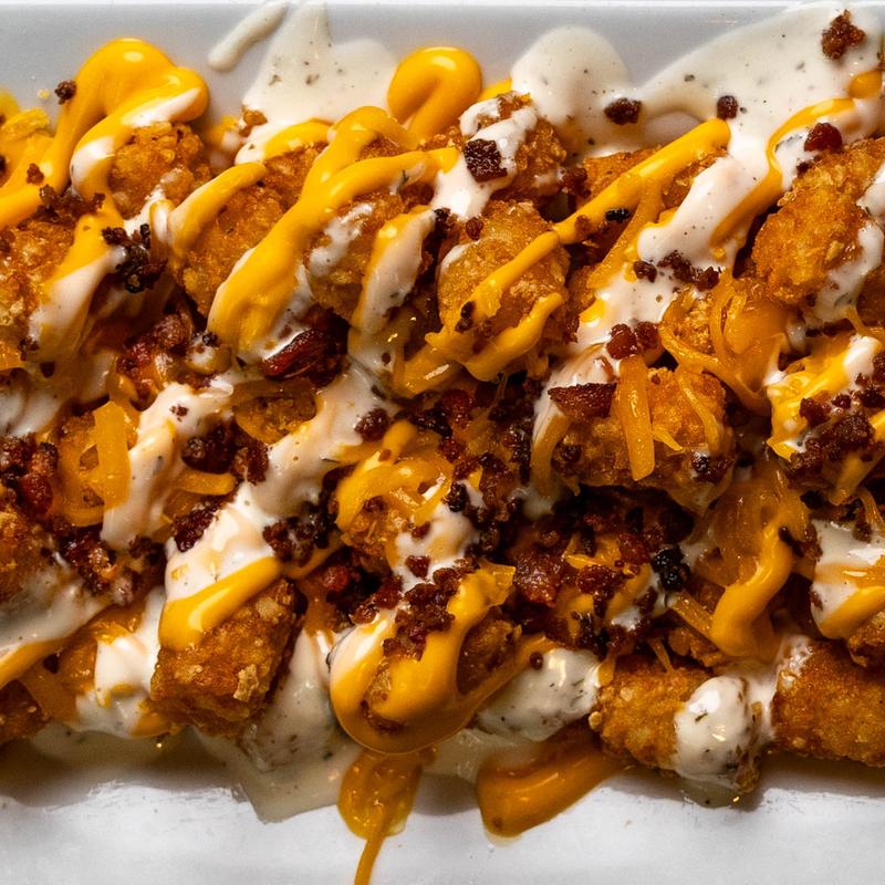 Tots loaded with cheese, bacon, and ranch dressing.
