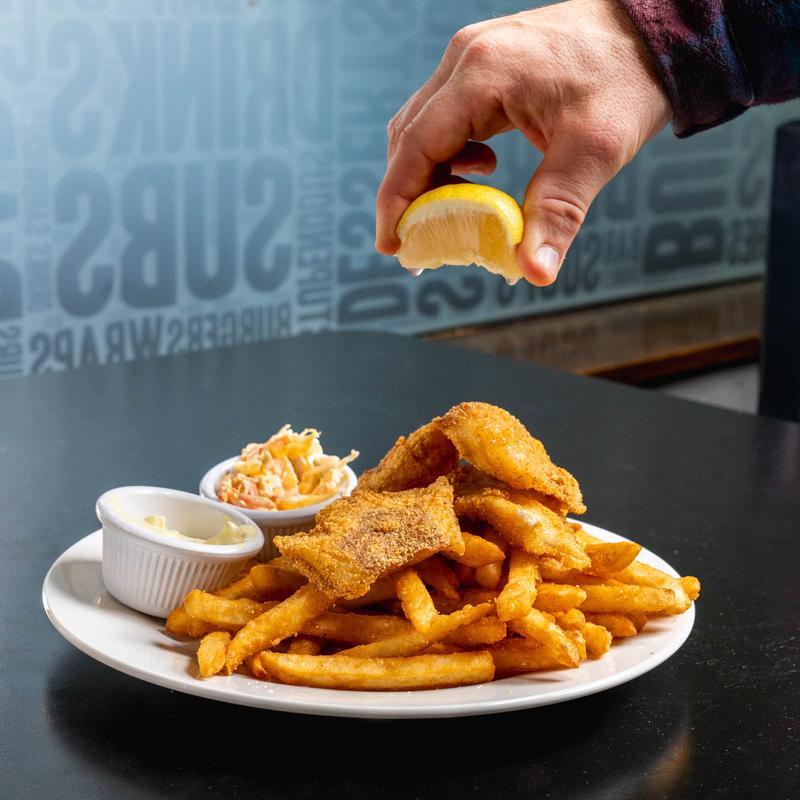 Medallions of cod coated with Louisiana seasoned bread crumbs. Served with fries and coleslaw.